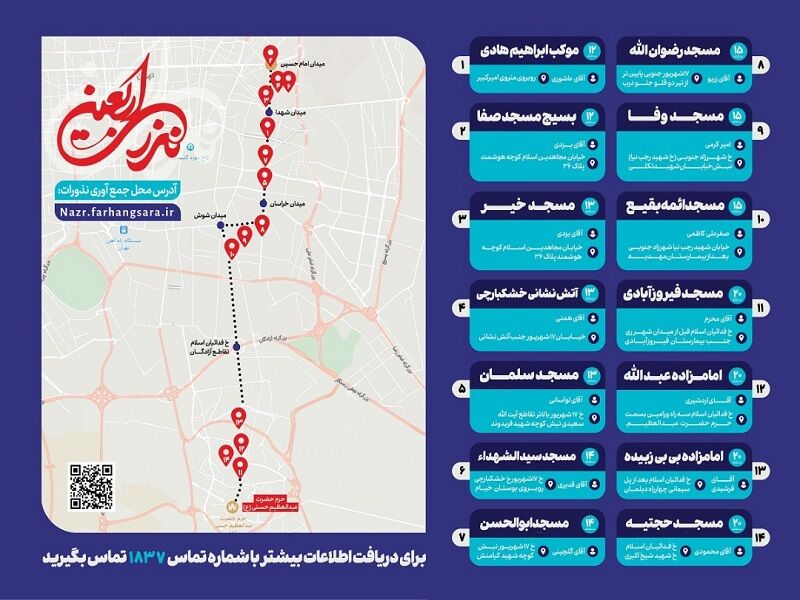 پویش «نذر اربعین» با هدف رساندن نذورات به جاماندگان و عزاداران حسینی در مسیر پیادهروی اربعین برگزار میشود. علاقهمندان برای شرکت در این پویش میتوانند به سامانه nazr.farhangsara.ir مراجعه کنند یا با سامانه تلفنی ۱۸۳۷ تماس بگیرند.
