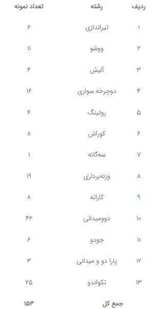 در ذیل جدول فراوانی نمونهگیریهای دوپینگ زنان در ۶ ماهه نخست سال ۱۴۰۱ آمده است: