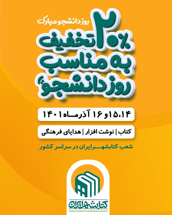 شعب کتابشهر ایران در سراسر کشور همزمان با روز دانشجو برای علاقهمندان به کتاب و محصولات فرهنگی تخفیف ۲۰ درصدی درنظر گرفتهاند.