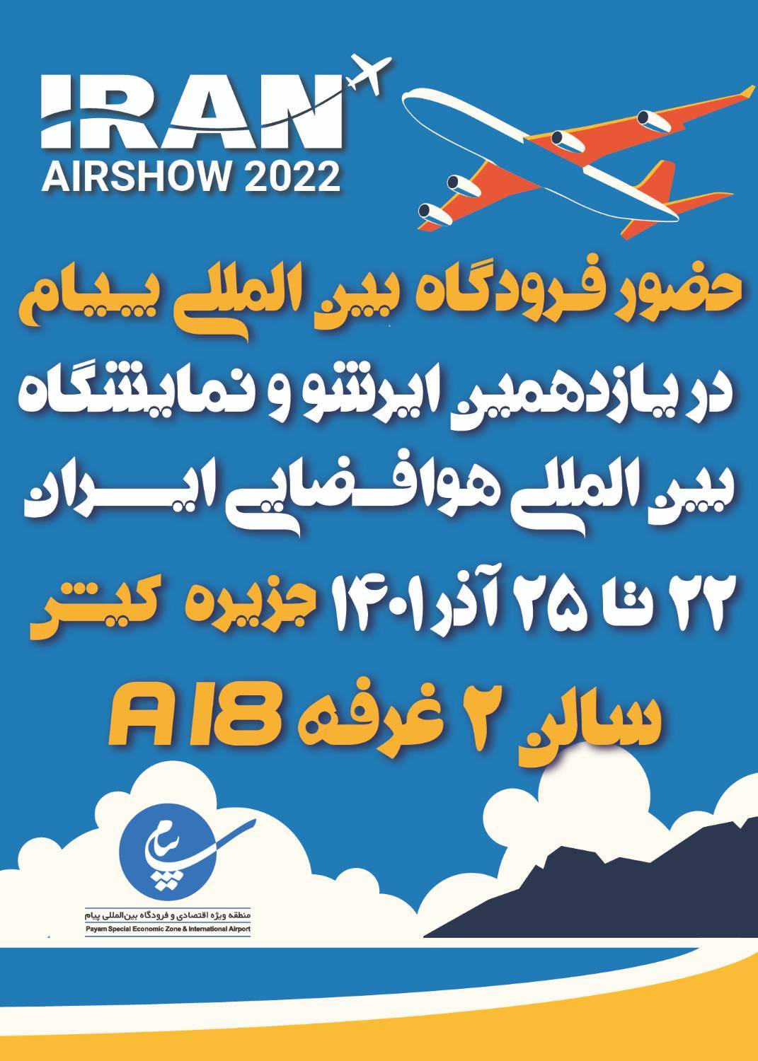 یازدهمین نمایشگاه بین المللی هوایی ایران با نام گذاری «تولید، دانش بنیان، اشتغال آفرین در حوزه فناوری پیشرفته صنایع هوافضایی به عنوان لبه فناوری» در تاریخ 22 لغایت 25 آذر ماه 1401 مطابق با 13 لغایت 16 دسامبر 2022 با حضور گسترده شرکتهای دانش بنیان، مراکز تحقیقاتی و پژوهشی و پشتیبانی تجهیزات هوایی، مارکز صنعتی، تولیدی و ساخت و شرکتهای داخلی و خارجی فعال در جزیره کیش برگزار میشود.