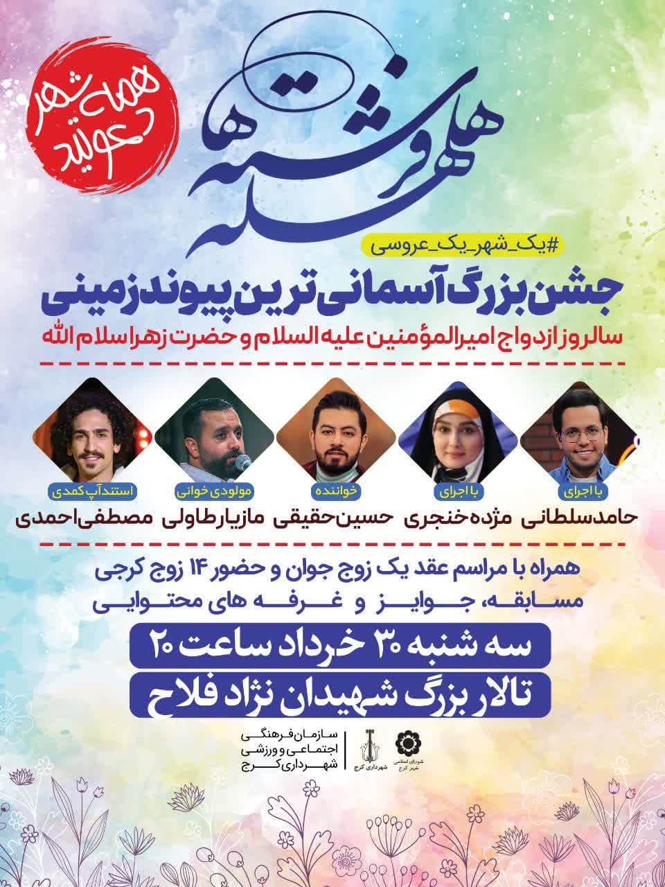 در این جشن که «حامد سلطانی» و «مژده خنجری» اجرای آن را به عهده دارند، مراسم عقد یک زوج جوان برگزار میشود و زوجهای جوان کرجی مهمانان ویژه این ازدواج هستند.