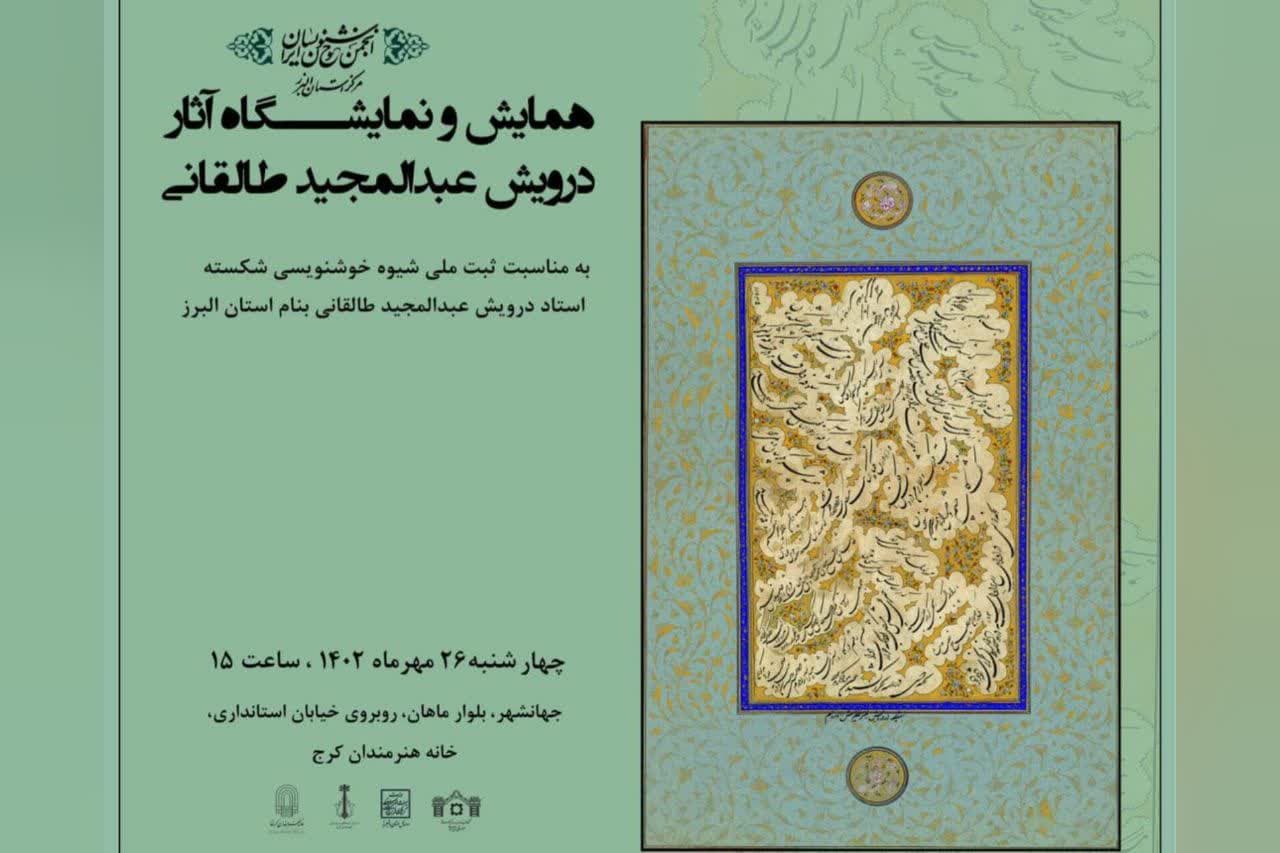 نمایشگاه و همایش بزرگداشت درویش عبدالمجید طالقانی هنرمند بزرگ خوشنویسی البرز در عصر صفوی و رونمایی از لوح ثبتی آثار این هنرمند برگزار میشود.