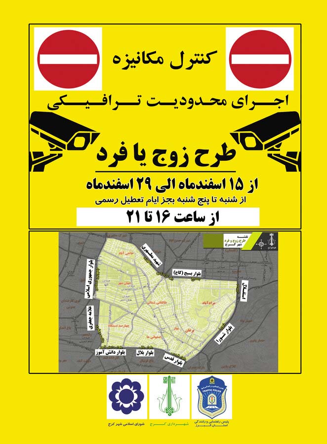 شهر کرج، مقرر شد طرح زوج و فرد در هسته مرکزی این کلانشهر از تاریخ ۱۵ تا ۲۸ اسفندماه سال جاری و از ساعت ۱۶ تا ۲۱ اجرایی شود.