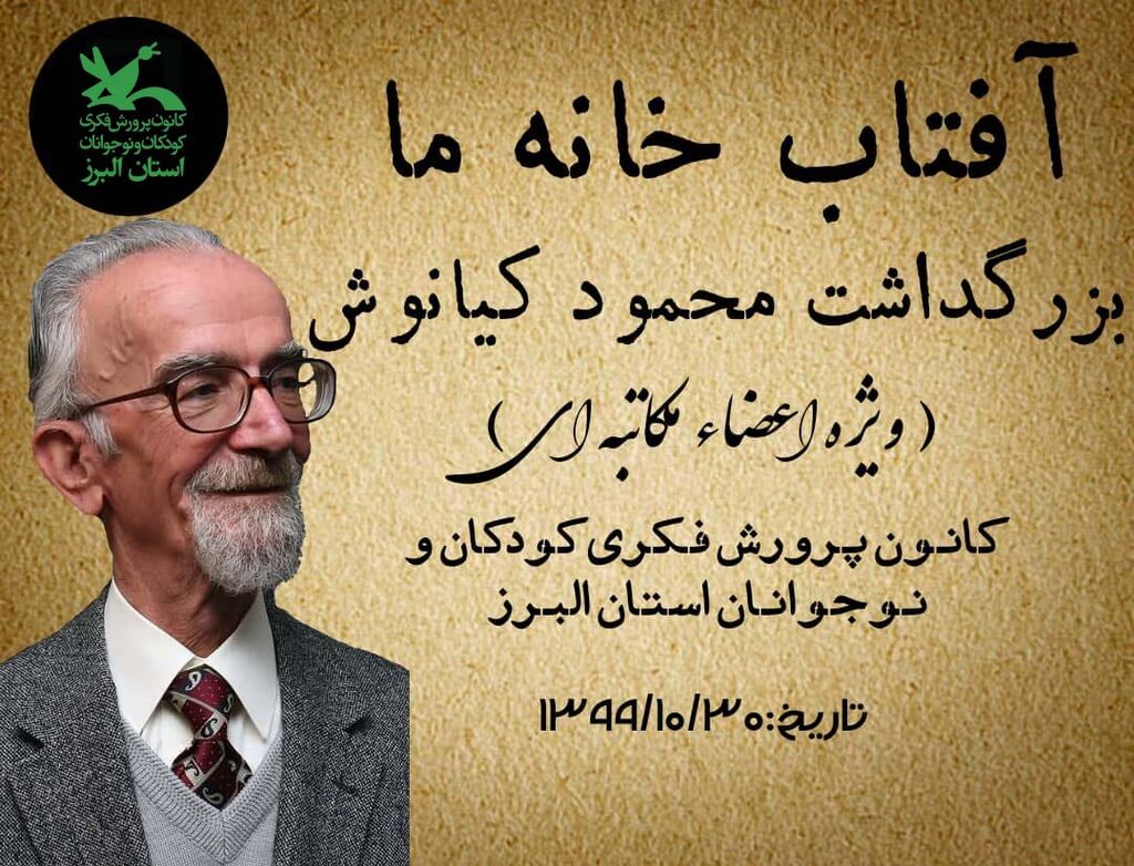 واحد ادبی کانون استان البرز ویژه برنامه «آفتاب خانه ما» را به منظور بزرگداشت مححمود کیانوش و قدردانی از زحمات این شاعر خوب کودک و نوجوان و به صورت مجازی اجرا کرد.