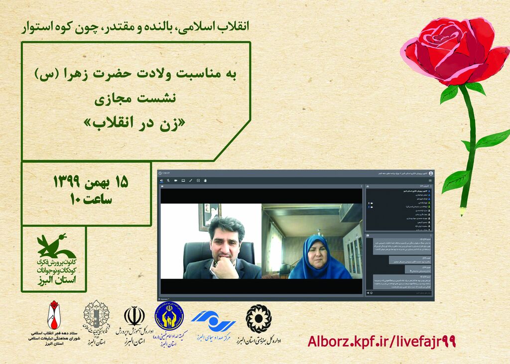 لازم به توضیح است که نشست مجازی«زن در انقلاب» از سلسله نشستهای پیشبینی شده کارگروه کودک ونوجوان ستاد دهه فجر استان البرز بود که روز چهارشنبه ۱۵ بهمن ماه با حضور مدیران کل کانون استانهای البرز و کرمانشاه، معاون فرهنگی، اجرایی، کارشناسان، مسئولان، مربیان و جمعی از اعضای مراکز کانون در استان البرز از ساعت ۱۰ الی 11 و 30 برگزار شد.