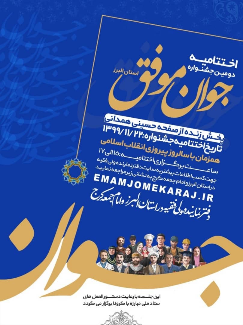 اختتامیه دومین جشنواره «جوان موفق» استان البرز همزمان با چهل و دومین سالگرد پیروزی شکوهمند انقلاب اسلامی، روز چهارشنبه ۲۲ بهمنماه از ساعت ۱۵ عصر در سالن شهیدان نژاد فلاح کرج برگزار میشود.