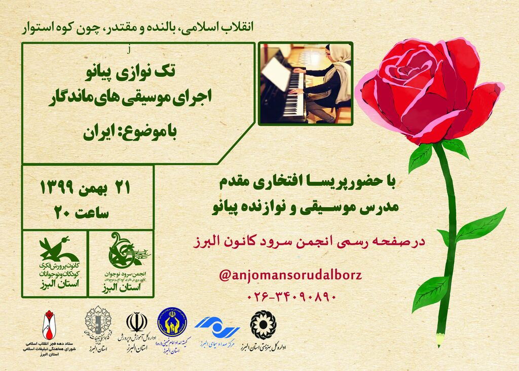 باقری همچنین گفت: ساعت ۲۰ روز سهشنبه ۲۱ بهمن ۱۳۹۹ «پریسا افتخاری مقدم»، مدرس موسیقی و نوازنده پیانو که تا کنون دو دوره آموزشی «نت شناسی» و «آواخوانی» را برای اعضای انجمن سرود کانون البرز، برگزار کرده میهمان صفحه رسمی انجمن به نشانی anjomansorudalborz@خواهد بود و موسیقیهای ماندگار ایران را خواهخد نواخت.
