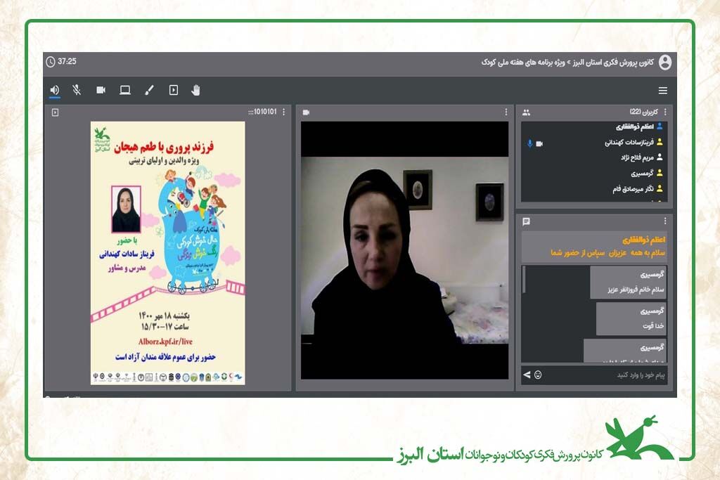 گفتنی است این نشست آموزشی تخصصی به همت واحد آموزش ادارهکل کانون پرورش فکری کودکان و نوجوانان و متناسب با نامگذاری روز سوم هفته ملی کودک ۱۸ مهر ماه ۱۴۰۰ که به نام «کودک، خانواده، آموزش و مهارتهای زندگی» نامیده شده بود، برگزار شد .