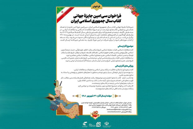 فرهنگی- امیدبانوان؛ روابط عمومی خانه کتاب و ادبیات ایران نوشت: دبیرخانه جایزه جهانی کتاب سال جمهوری اسلامی ایران، سیامین دوره این جایزه را با هدف شناسایی و معرفی کتابهای ارزشمند در دو حوزه مطالعات اسلامی و مطالعات ایرانی در سه بخش تالیف، ترجمه و تصحیح که برای نخستین بار طی سال گذشته میلادی(۲۰۲۱) به زبانهای گوناگون در کشورهای مختلف (غیر از ایران) چاپ شده است، در بهمنماه ۱۴۰۱ برگزار میکند.