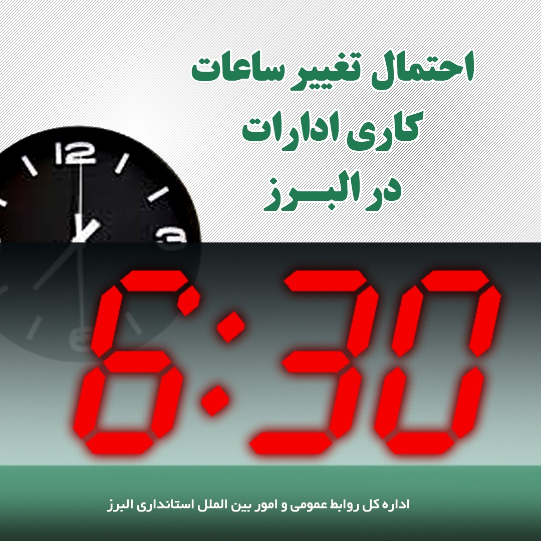 البرز- امید بانوان؛ معاون توسعه مدیریت و منابع استانداری البرز گفت: احتمالا طی چند روز آینده ساعت کاری ادارات در البرز با هدف کاهش مصرف برق در استان تغییر می کند.