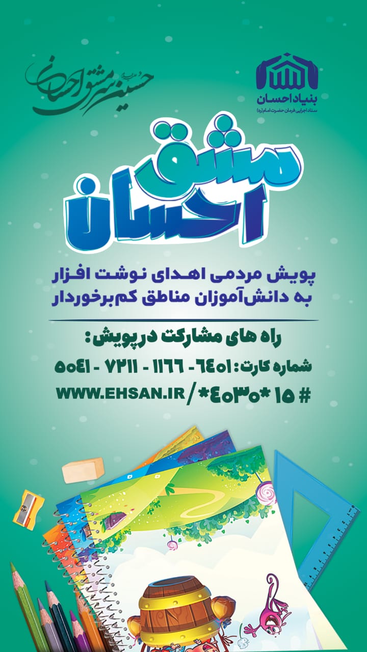 پویش مشق احسان با هدف تهیه و توزیع ۷۳۰۰ بسته کیف و لوازم التحریر در مناطق کم برخودار استان البرز اجرایی میشود.